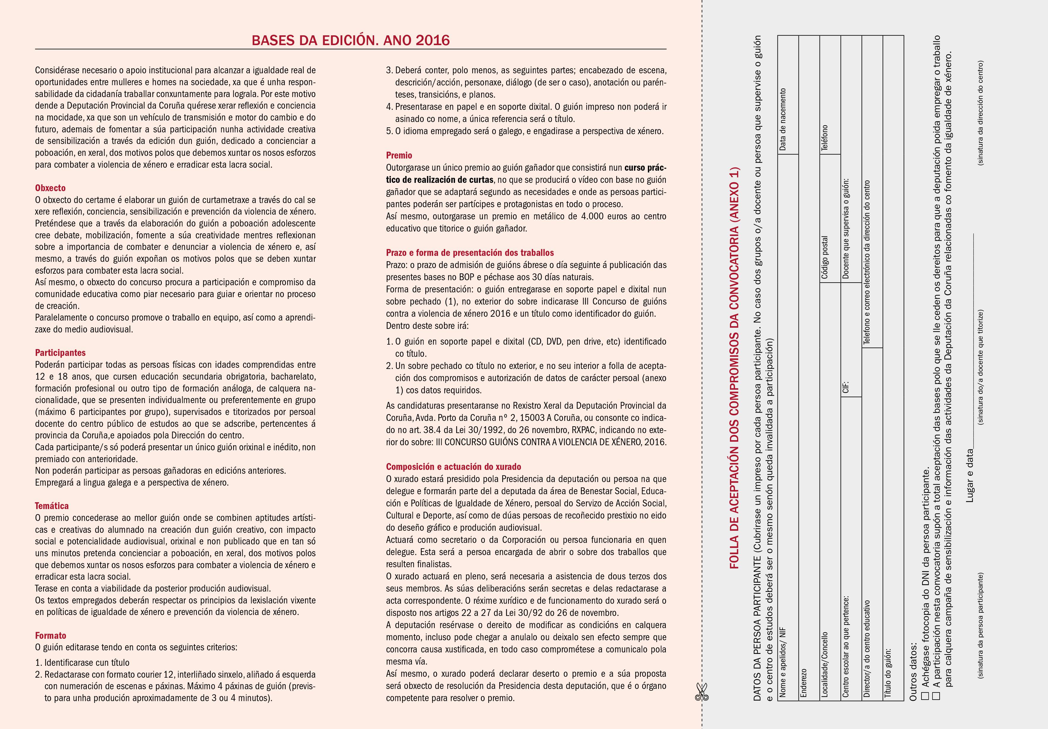 Quérese convidar a todas as persoas físicas con idades comprendidas entre os 12 e os 18 anos, que cursen ESO, bacharelato, FP ou outro tipo de formación análoga na elaboración dun guión de curtometraxe a través do cal se xere reflexión, conciencia , sensibilización e prevención en violencia de xénero.