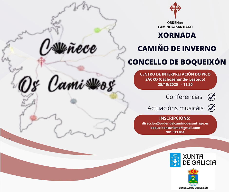 A Orde do Camiño de Santiago organiza unha xornada sobre o Camiño de Inverno, que terá lugar este sábado 25 de outubro, a partir das 11:30 horas, no Centro de Interpretación do Pico Sacro (Cachosenande-Lestedo). A participación é de balde, se ben o número de prazas é limitado polo que é preciso inscrición previa en direccion@ordendelcaminodesantiago.es ou no Departamento de Formación, Emprego e Turismo do Concello de Boqueixón (981 513 061 ou boqueixonturismo@gmail.com).
