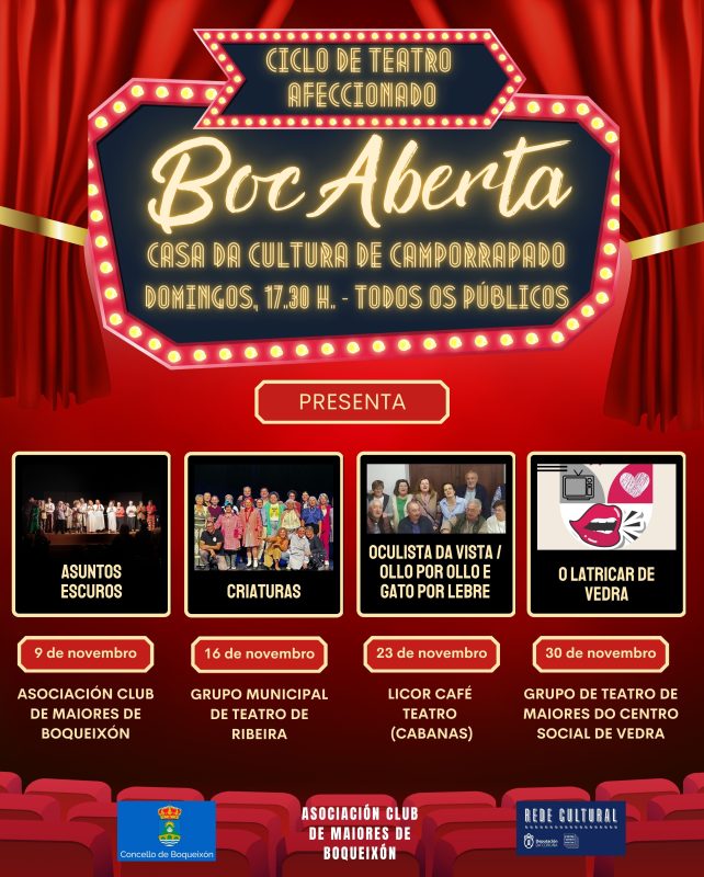 A Casa da Cultura de Camporrapado acollerá durante os próximos catro domingos de novembro unha nova edición do ciclo de teatro amador BocAberta, organizado polo Concello de Boqueixón en colaboración coa Asociación Club de Maiores de Boqueixón e a Rede Cultural da Deputación da Coruña. Catro sesións dirixidas a todos os públicos e cuxa entrada é completamente libre e de balde os domingos 9, 16, 23 e 30 de novembro, ás 17:30 horas.