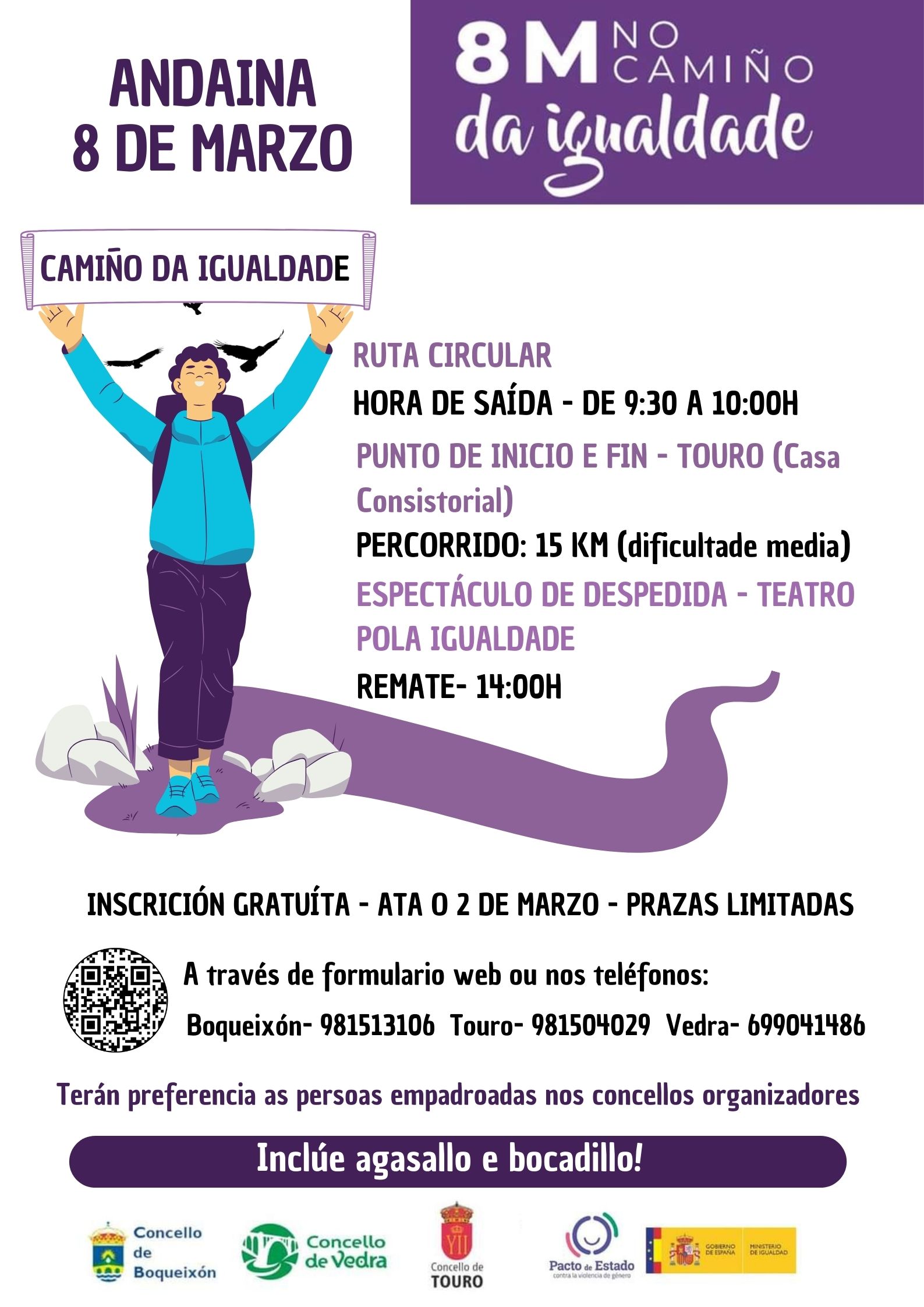 O Concello de Boqueixón informa da apertura do prazo de inscrición na andaina gratuíta «8 M. No Camiño da Igualdade», que terá lugar o próximo domingo 8 de marzo co gallo da conmemoración do Día Internacional da Muller. Un evento organizado polos Concellos de Boqueixón, Vedra e Touro, ao abeiro do Pacto de Estado contra a Violencia de Xénero e co apoio do Ministerio da Igualdade.