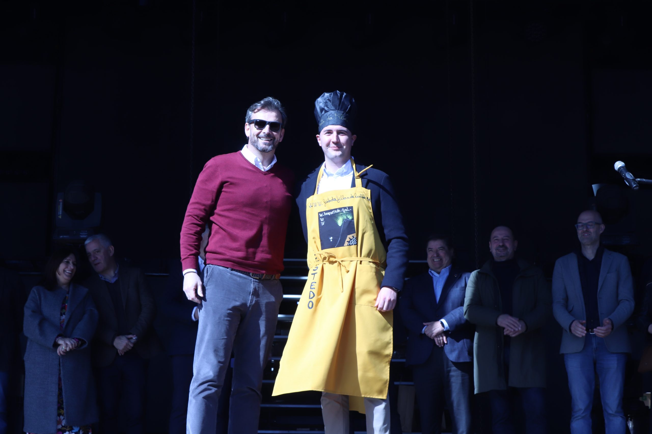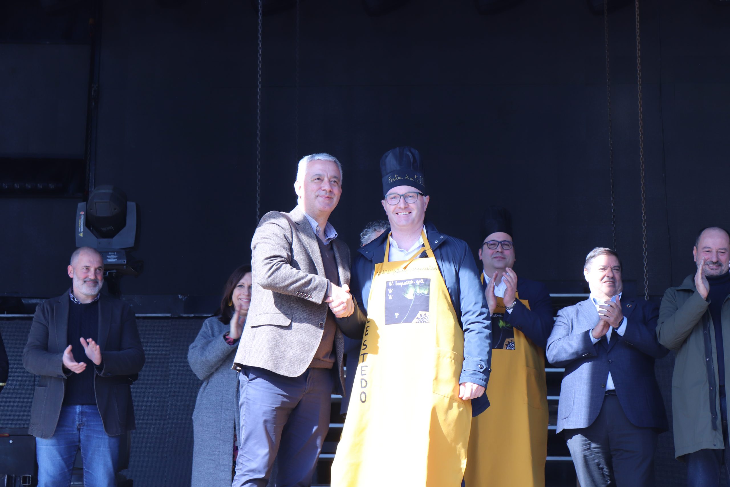 - o conselleiro de Educación, Ciencia, Universidades e Formación Profesional, José López Campos, imposto Juan Manuel Silva Hermida, presidente da Asociación Cultural da Filloa, non sen certa dificultade, debido á diferenza de altura. López Campos agradeceu a distinción porque “fun alcalde durante moitos anos do pobo irmán da Estrada e, seguindo ás beiras do Ulla, sempre me une poder compartir estas fermosas festas gastronómicas. E felicitar a quen se encargou do tempo porque temos un día precioso para desfrutar dunha das mellores festas de Galicia”.