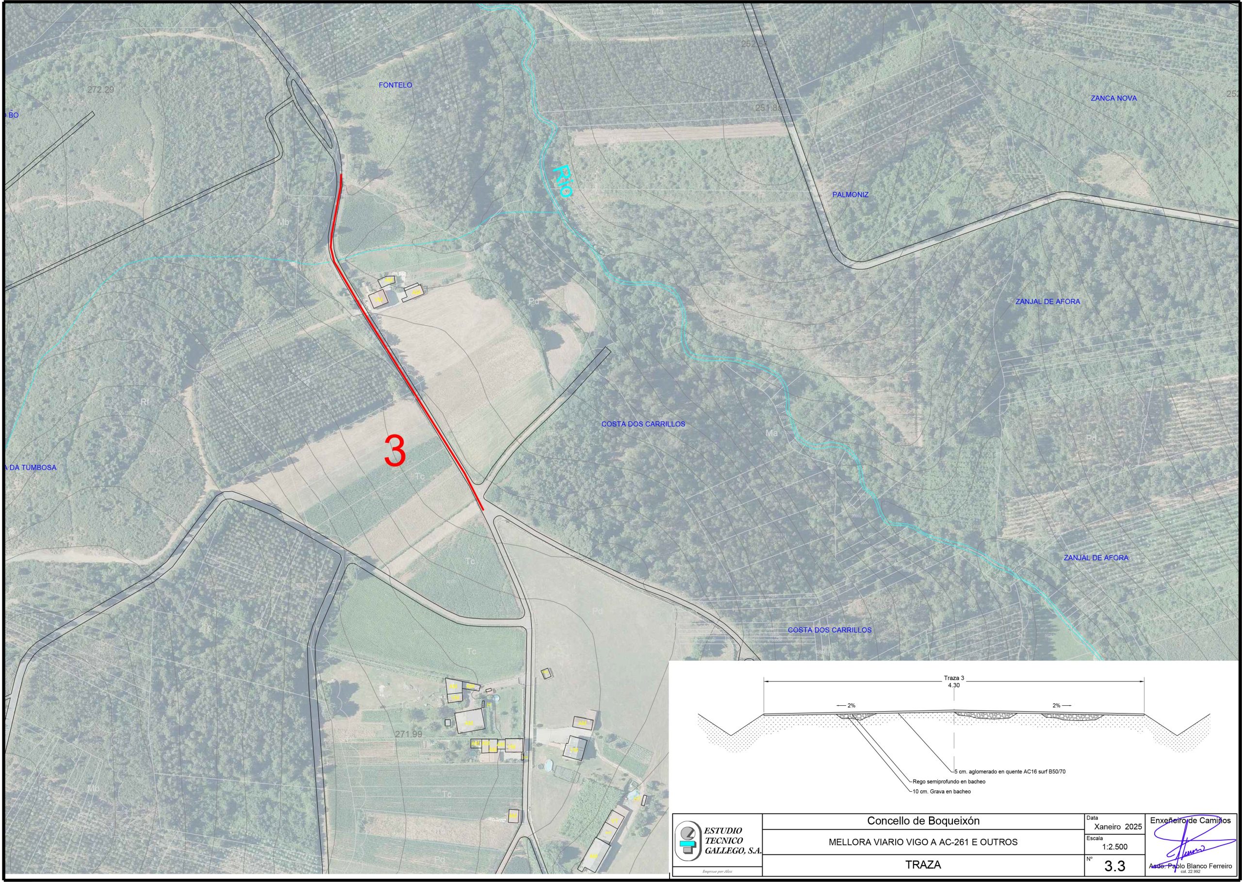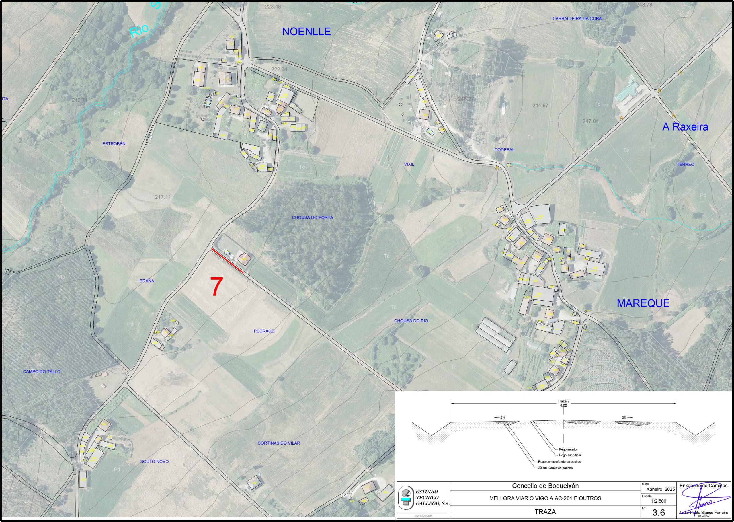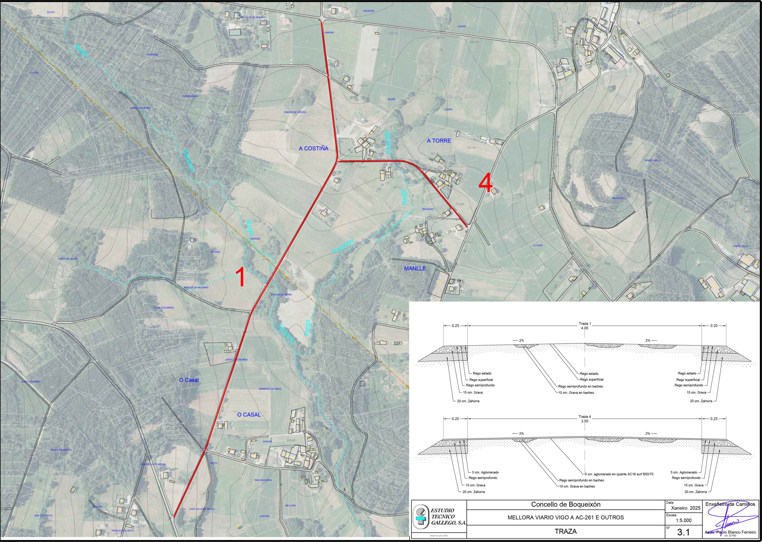 - Mellora do viario Vigo á AC-261. Mellora da capa de rodaxe dunha estrada de 1.389 metros de longo e 4,5 metros de ancho, con 150 metros cadrados de abanicos. As obras incluirán unha ampliación da estrada de medio metro en cada lado, o bacheo previo de todo o viario e a mellora da capa de rodaxe con tratamento asfáltico superficial e rego de selado. Finalmente contémplase a apertura de gabias e limpeza de salvagabias para a correcta drenaxe lonxitudinal e transversal.