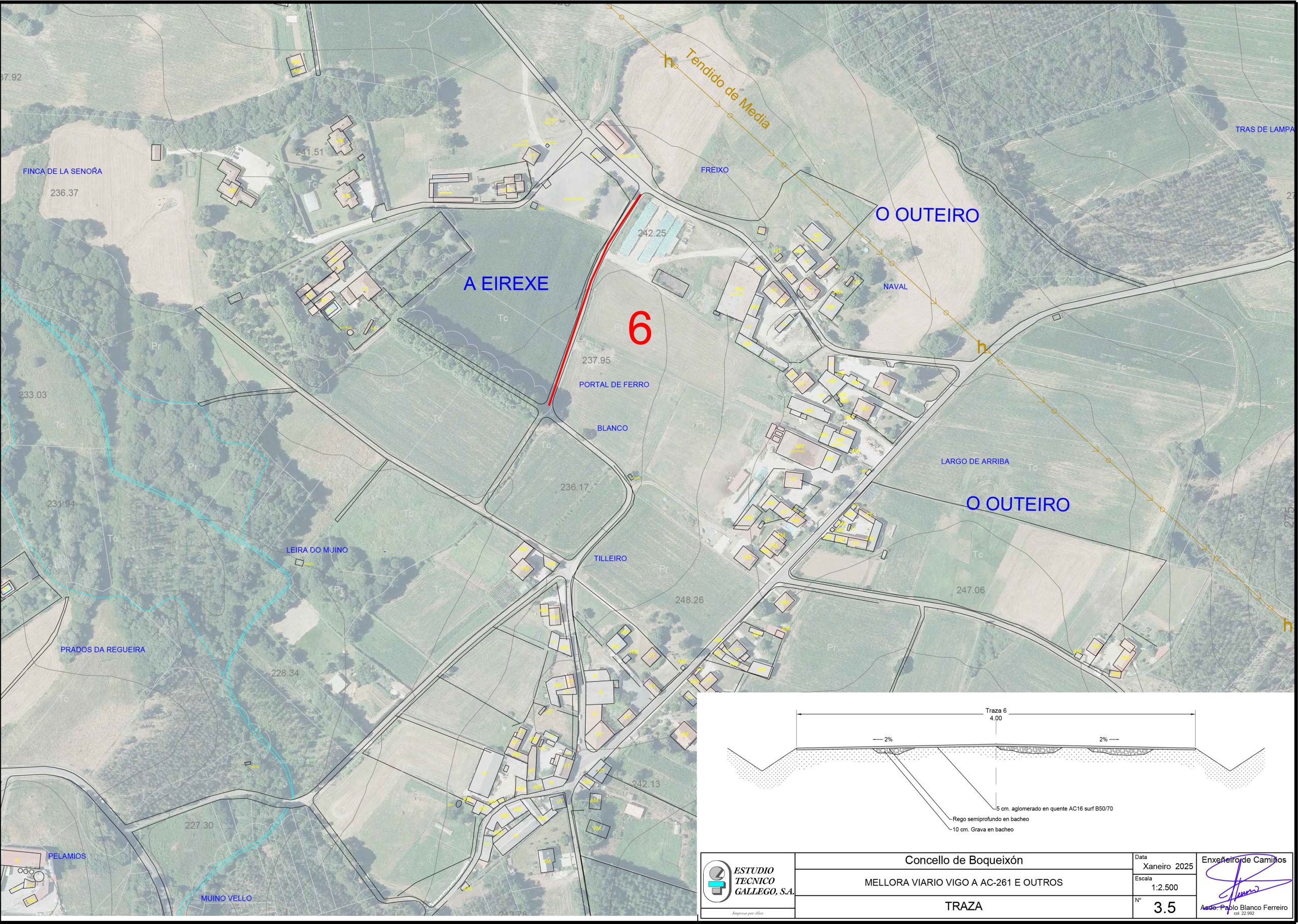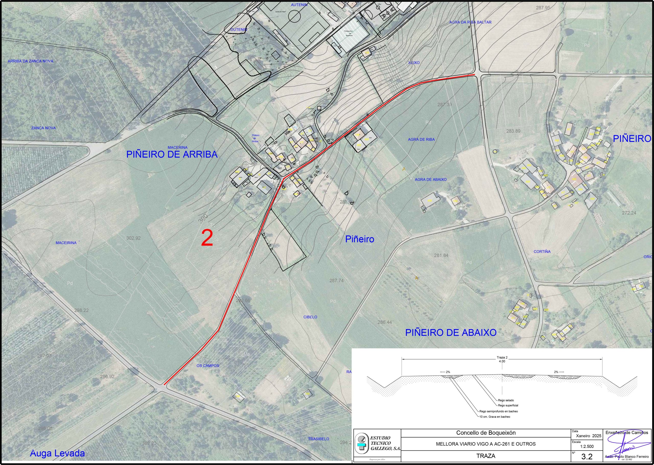 - Mellora dos accesos a Piñeiro de Arriba. Mellora da capa de rodaxe dun viario de 200 metros de longo e 4 metros de ancho, así como 100 metros cadrados de abanicos, cun tratamento asfáltico superficial e rego de selado, previo bacheo con grava e tratamento asfáltico semiprofundo. Finalmente acometerase a apertura de gabias e limpeza de salvagabias nuns 700 metros para garantir a correcta drenaxe da zona.