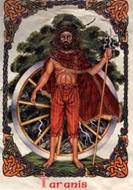 O nome do deus Taranis provén de taran, trono, e pode asemellarse co Thor, da mitoloxía nórdica ou Xúpiter, da romana. É o causante do nacemento do muérdago mediante un raio que cae na rama dun carballo, pasando a representar a unión do ceo e da terra (recordemos que Plinio el Viejo comenta que non había nada máis sagrado para os celtas que os carballos, especialmente aqueles nos que crecerá o muérdago na súa corteza). Para os pobos de cultura céltica Taranis, o seu deus supremo, é tamén o deus dos fenómenos atmosféricos, as treboadas, os raios e os tronos, como Iovi Tonans (Jupiter Tonante). Taranis está vinculado a os montes e lugares elevados e aparece como Iupiter Candamius en advocacións de época romana. No que respecta á teoloxía posuimos tres tipos de testemuñas (si exceptuamos a iconografía): as dos escritores grecorromanos, as epigráficas e as que ofrecen as narracións mitolóxicas medievais. Á fonte principal é César, aínda que, teremos que ter en conta que realiza unha una interpretatio dos Deuses celtas, romanizando os seus nomes (e non sabemos ata qué punto tamén as súas funcións): o Deus que veneran de xeito máis notorio e a Mercurio o consideran inventor das artes, guía dos camiños e viaxeiros; despois adoran a Apolo (cura as enfermidades), a Marte (preside as guerras), a Xúpiter (domina o ceo) e a Minerva (responsable das artes e a industria) (César, Guerra de las Galias 6,17). O Xúpiter reflexado por César podemos relacionalo, grazas á epigrafía, con Taranis o deus do trono e do ceo.